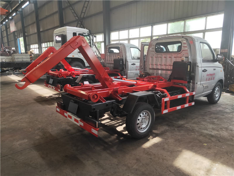 勾臂垃圾车【车厢可卸式垃圾车】车体和垃圾箱可完全分离,由液压系统来完成收箱/放箱,在平日里可将车载垃圾箱放置到各个垃圾收集点,待垃圾收集满后,该车可直接开赴收集点,通过液压系统的操控,可将垃圾车后座上加装的勾臂放下,挂住站内箱体前端的连接点,将垃圾箱拉车体的后座上,此时即可开动车辆,将垃圾运送垃圾处理站内,进行自卸式倾倒,优点就是可一车配多斗,一辆车就可以维持数个垃圾收集站的运转,效率高,且箱体为密封式设计,不会造成二次污染。