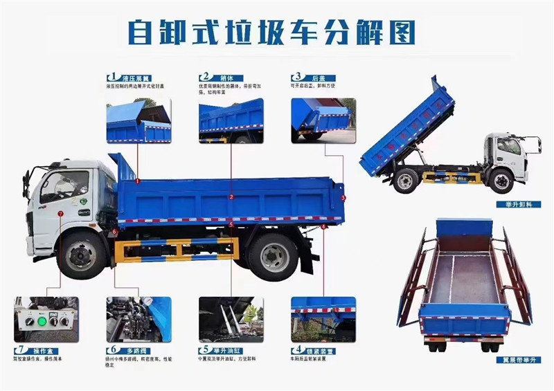 自卸式垃圾车,箱式环保无滴漏清运生活垃圾自卸车,小区垃圾密封车,粪污粪便车,厢体液压油缸举升卸料,顶盖装料口翼展两侧翻转开启,后门链条拉紧(可选液压油缸锁紧)、四周耐腐蚀密封条密封、运输中环保无滴漏,箱体控制驾驶室内操作。箱体连接处满焊加工,箱体底部打三角稳固加工,防腐防锈处理,内部平整光滑,保证了自卸粪污粪便、含水污泥的平顺性,后门耐腐蚀密封条密封,保障了密封性运输中滴水不漏。
