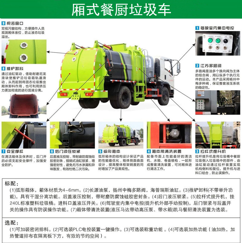 方罐式餐厨垃圾车:弧形厢体,箱体内可实现固液分离,推铲卸料,后盖液压控制开启/锁紧(带耐磨橡胶密封条密封-后门关闭后滴水不漏),后门液压锁紧防误操作功能,挂桶式提升机,可配合120升、240升标准垃圾桶使用,清洗装置(带水箱、液压马达带动高压泵)。