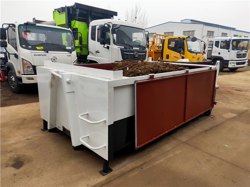 勾臂垃圾车【车厢可卸式垃圾车】车体和垃圾箱可完全分离,在平日里可将车载垃圾箱放置到各个垃圾收集点,待垃圾收集满后,该车可直接开赴收集点,通过液压系统的操控,可将垃圾车后座上加装的勾臂放下,挂住站内垃圾箱前端的连接点,将箱体拉在车体的后座上,此时即可开动车辆,将垃圾运送处理站内进行自卸式倾倒,优点就是可一车配多斗,一辆车就可以维持数个垃圾收集站的运转,效率高,且箱体为密封式设计,不会造成二次污染。